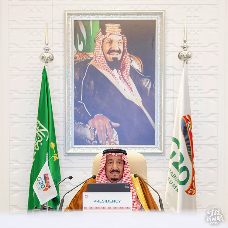 △沙特国王萨勒曼主持G20领导人第15次峰会第一阶段会议。(来源于G20官方社交媒体)