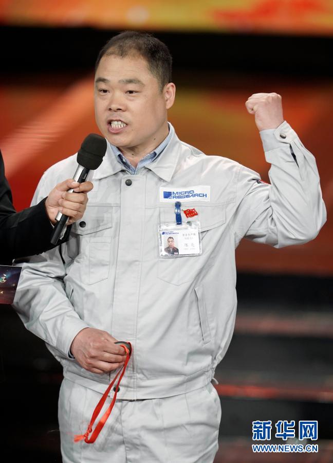 江苏省无锡微研股份有限公司高级技师陈亮在“最美职工”发布仪式上(2019年4月21日摄)。新华社记者才扬摄