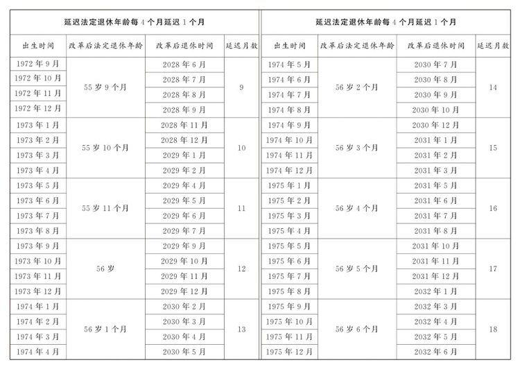 第一条 从2025年1月1日起,男职工和原法定退休年龄为五十五周岁的女职工,法定退休年龄每四个月延迟一个月,分别逐步延迟至六十三周岁和五十八周岁;原法定退休年龄为五十周岁的女职工,法定退休年龄每二个月延迟一个月,逐步延迟至五十五周岁。国家另有规定的,从其规定。