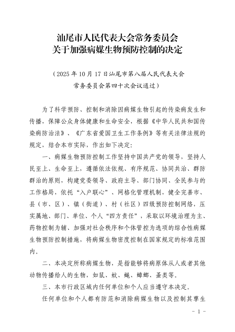 《汕尾市人民代表大会常务委员会关于加强病媒生物预防控制的决定》已由汕尾市第八届人民代表大会常务委员会第四十次会议于2025年10月17日通过,现予公布,自公布之日起施行。