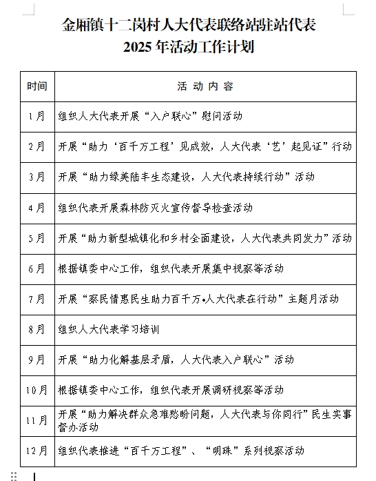 金厢镇十二岗村人大代表联络站驻站代表2025年活动工作计划