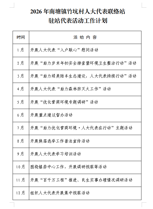 南塘镇竹坑村人大代表联络站2026年活动工作计划