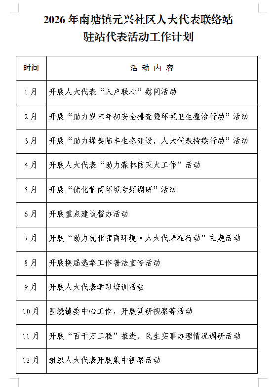 南塘镇元兴社区人大代表联络站2026年活动工作计划