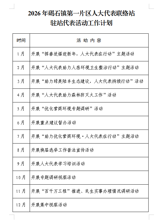 碣石镇第一片区人大代表联络站2026年活动工作计划