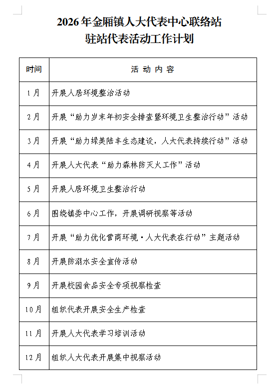 金厢镇人大代表中心联络站2026年活动工作计划
